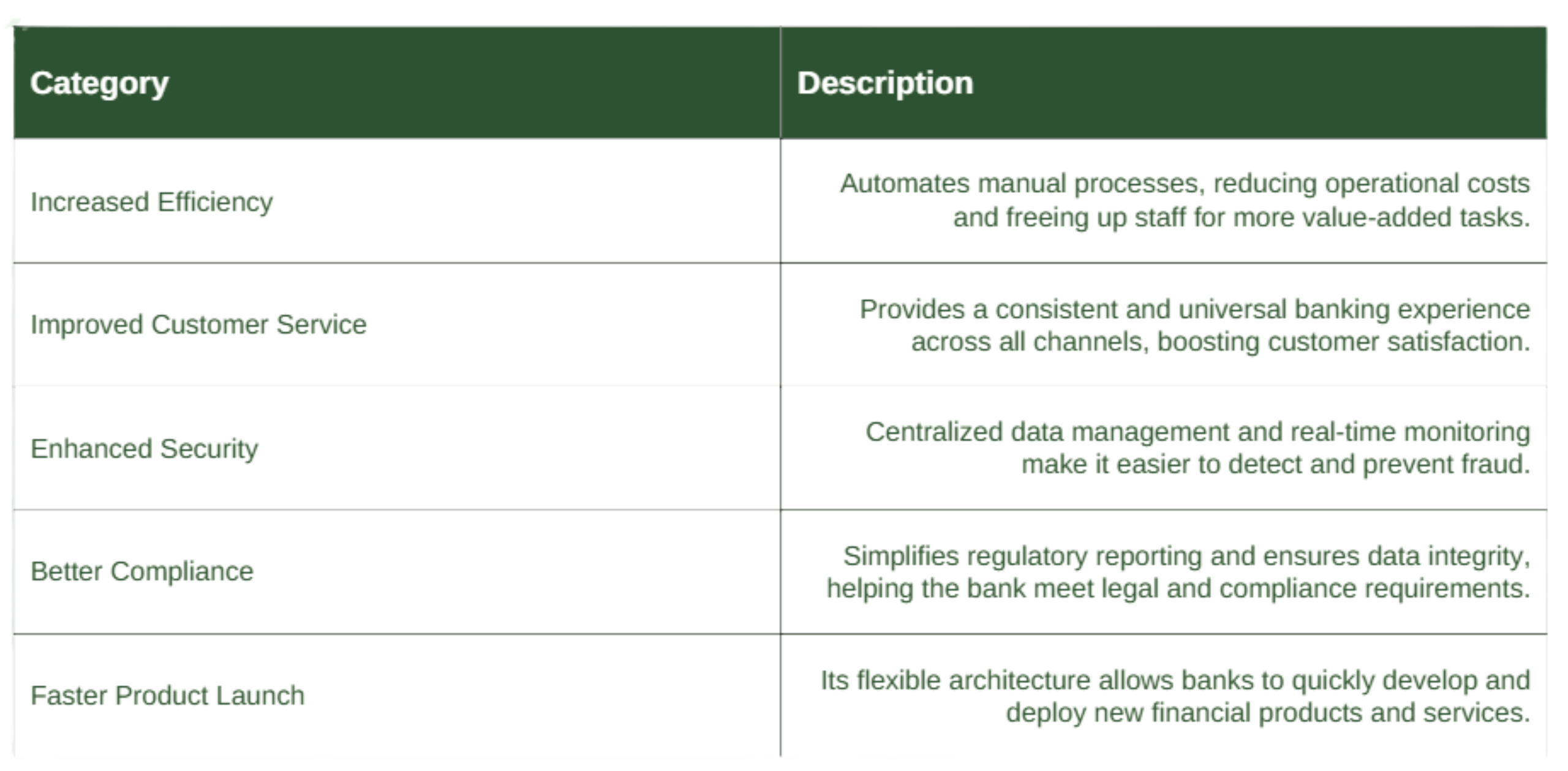 - Modular Architecture: The system is built with flexible, independent components that can be easily added, updated, or replaced, allowing banks to quickly launch new products and services.